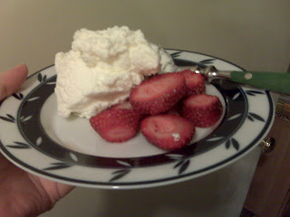 These strawberries were liberally sprinkled with Splenda and left in the fridge for a few hours. The cream was whipped by hand with lemon extract and Splenda. It was SUCH a good treat. It was so satisfying. Mike had thirds! I'm proud to say I only ate what is pictured, but damn, it was freakin' awesome.