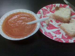 Trader Joe's tomato soup and leftover bread (see previous post), on a pretty plate that I stole from my boss's desk drawer.